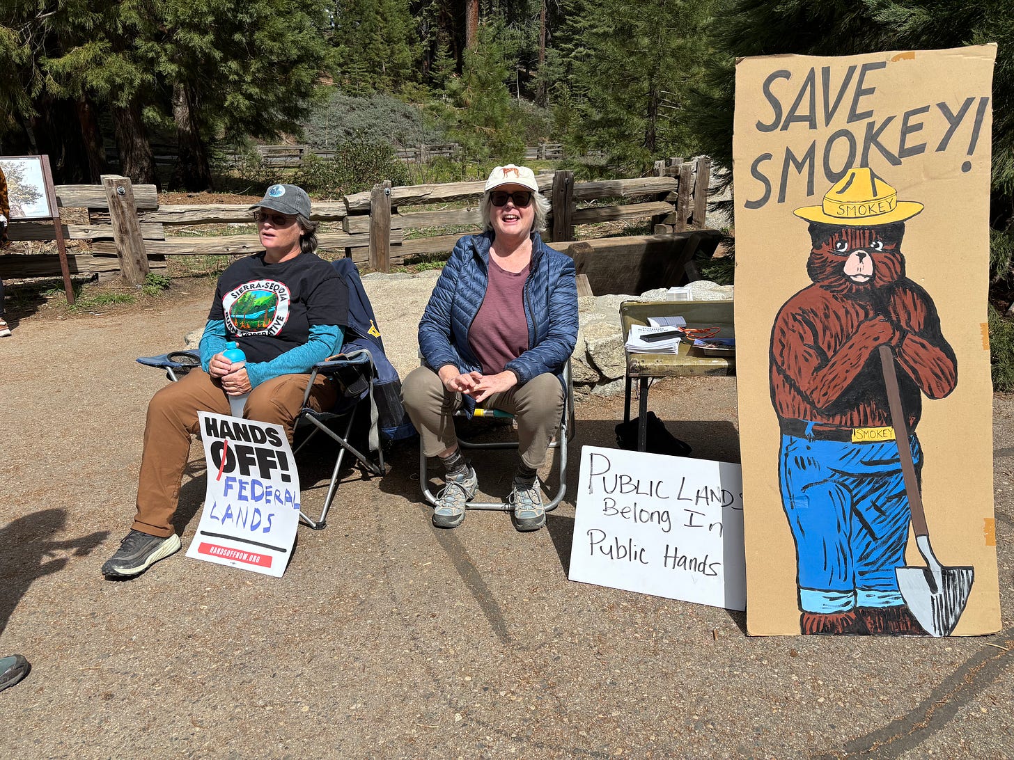 Retired NPS and USFS employees at the free speech area in Sequoia National Park’s Giant Forest to educate visitors about proposed cuts to public lands agencies on 4/6/26.