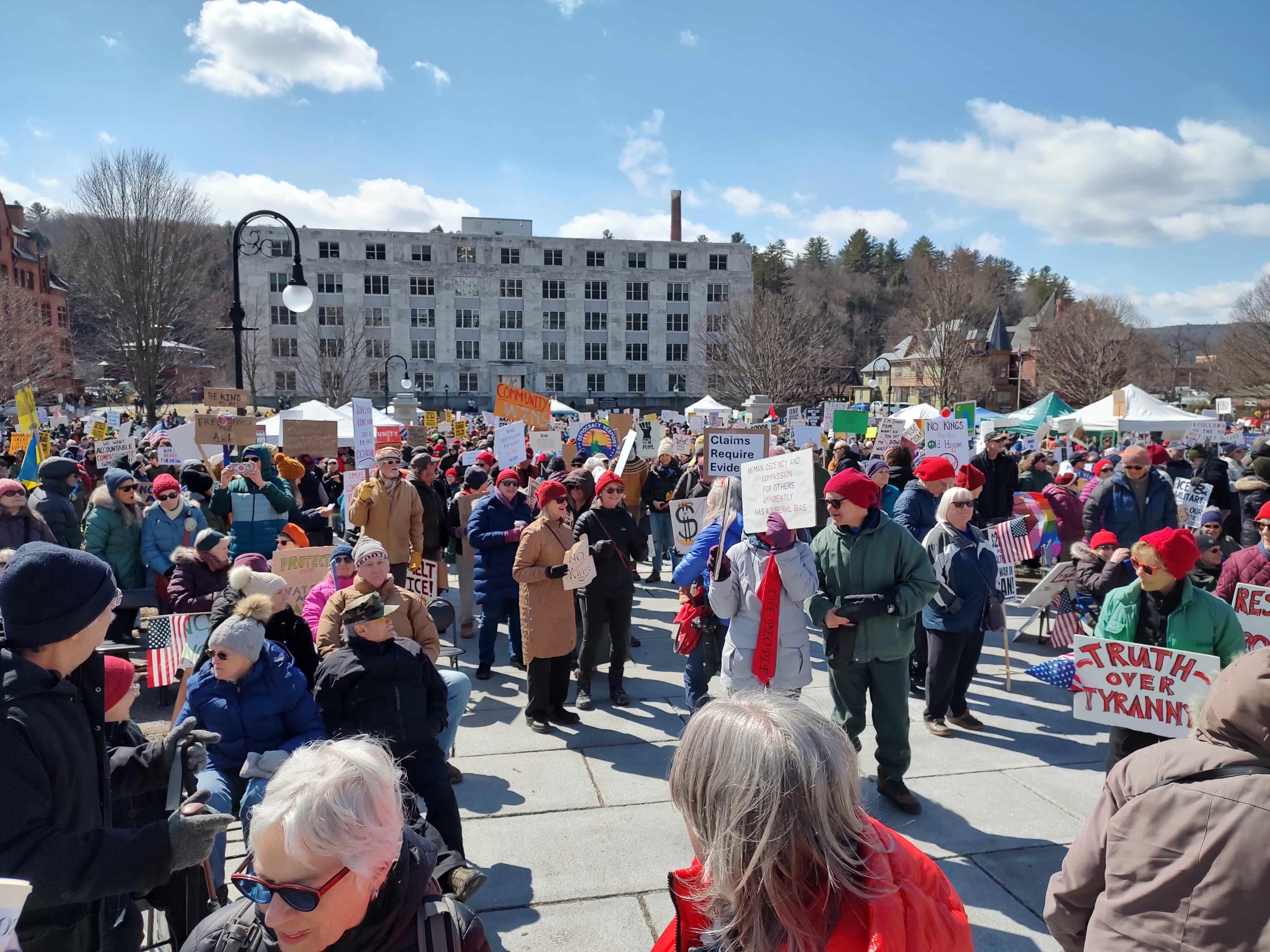 From the State House steps in Montpellier Vermont thousands rally for No Kings 3. Anti fascist knitted red hats abound