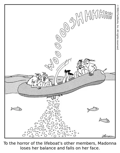 To the horror of the lifeboat’s other members, Madonna loses her balance and falls on her face.